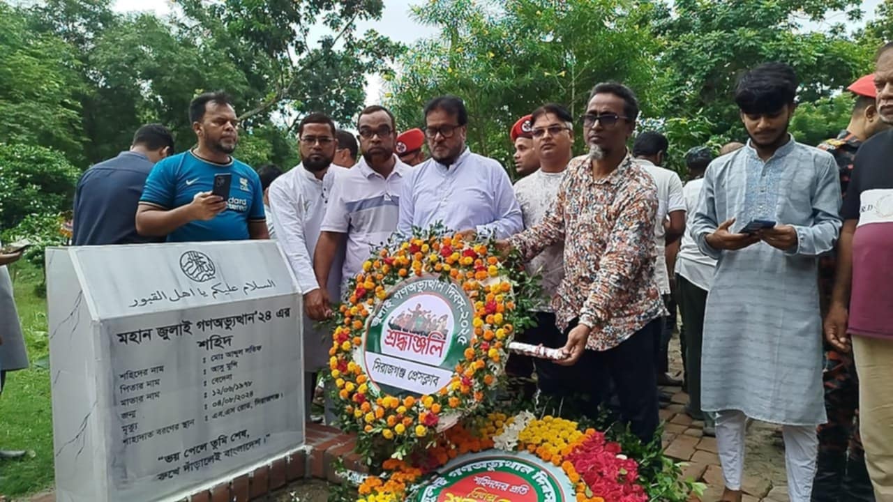 মঙ্গলবার (৫ আগষ্ট) গণঅভ্যুত্থান দিবসে সূর্যোদয়ের সাথে সাথে সিরাজগঞ্জ প্রেসক্লাব ভবনে জাতীয় পতাকা উত্তোলন করা হয়। সকাল ৯ টার সময় মালসাপাড়া পৌর কবরস্থানে শহীদ সুমন সেখ ও শহীদ আবদুল লতিফের কবরে পুষ্পস্তবক অর্পণ করে শ্রদ্ধা নিবেদন করেন প্রেসক্লাবের সভাপতি মোঃ হারুন অর রশিদ খান হাসান। পরে শহীদদের বিদেহী আত্মার মাগফিরাত কামনা করে দোয়া করা হয়। এ সময় উপস্থিত ছিলেন প্রেসক্লাবের সহ সাধারণ সম্পাদক গোলাম মোস্তফা রুবেল ও ইউসুফ দেওয়ান রাজু, অর্থ সম্পাদক নুরুল ইসলাম রইসি, দপ্তর সম্পাদক শেখ মোহাম্মদ এনামুল হক, সমাজকল্যাণ সম্পাদক মিলন শেখ, আপ্যায়ন সম্পাদক রেজাউল করিম খান সহ অনেক গণমাধ্যমকর্মী।পরে সিরাজগঞ্জ সদর উপজেলার কান্দাপাড়া কবরস্থানে সিরাজগঞ্জ ছাত্র গণআন্দোলন গণ-অভ্যুত্থানে প্রথম শহীদ জেলা যুবদলের যুগ্ম সাধারণ সম্পাদক সোহানুর রহমান রঞ্জুর কবরে পুষ্পস্তবক অর্পণ করে শ্রদ্ধা নিবেদন ও তার বিদেহী আত্মার মাগফিরাত কামনা করে দোয়া করেন প্রেসক্লাবের নেতৃবৃন্দ।